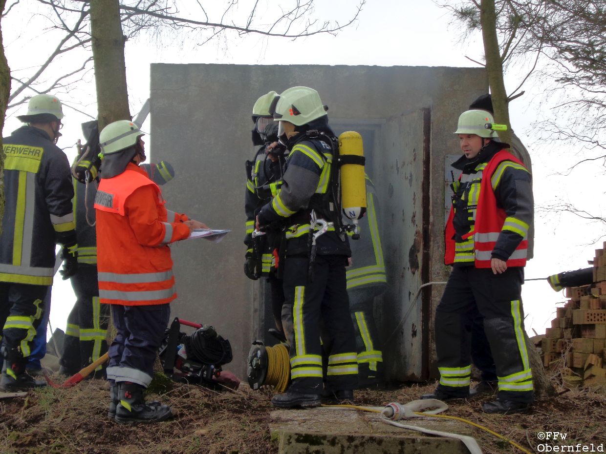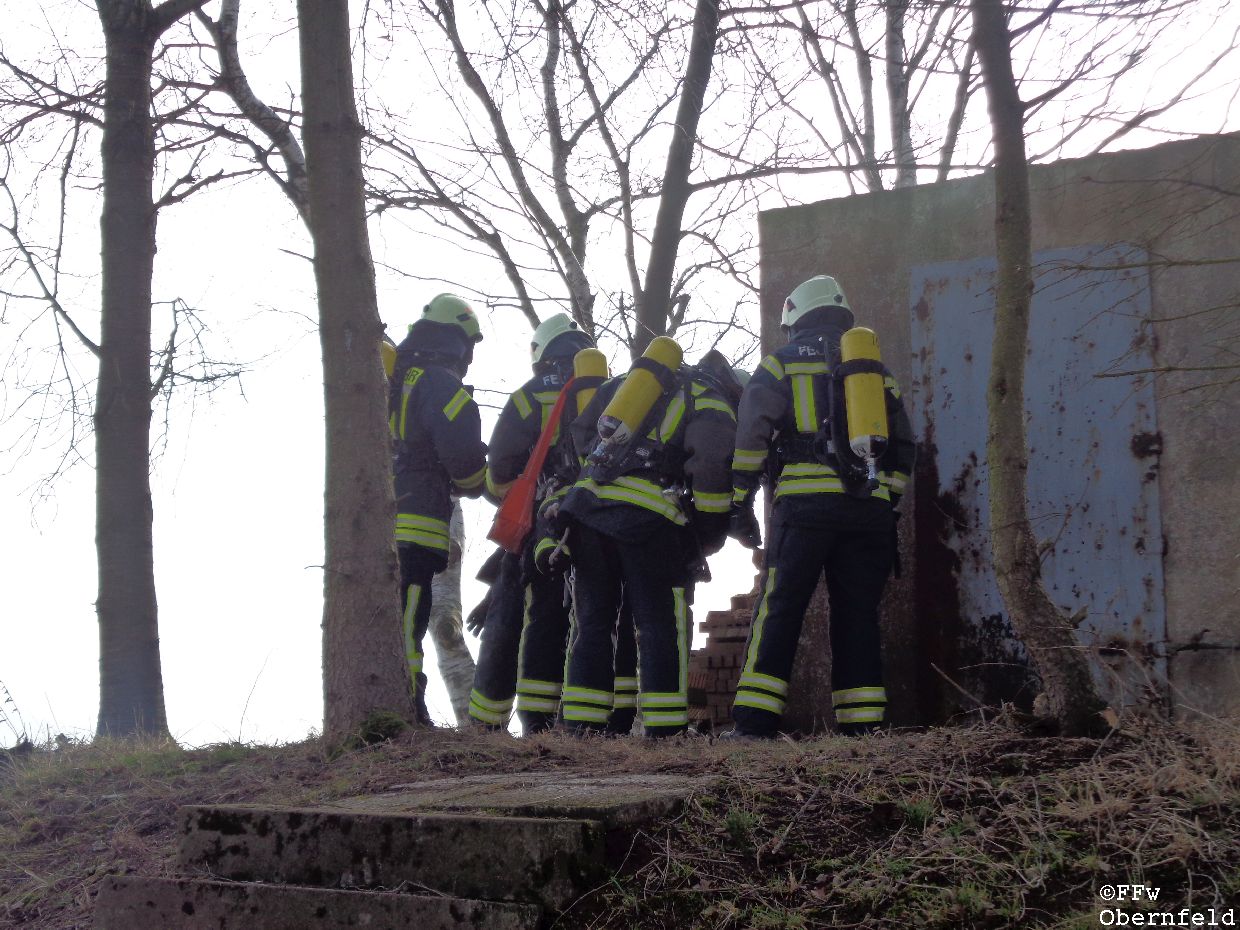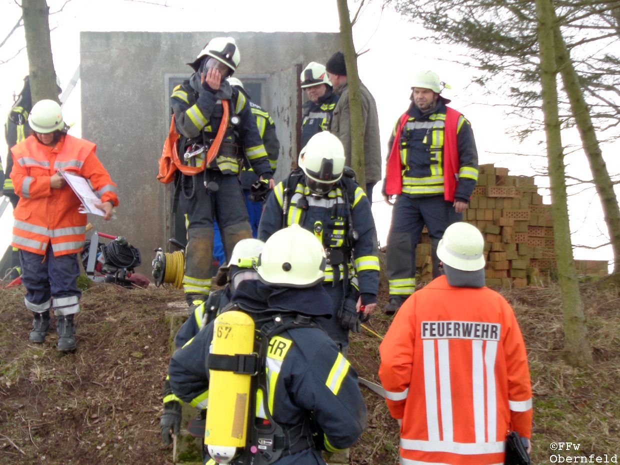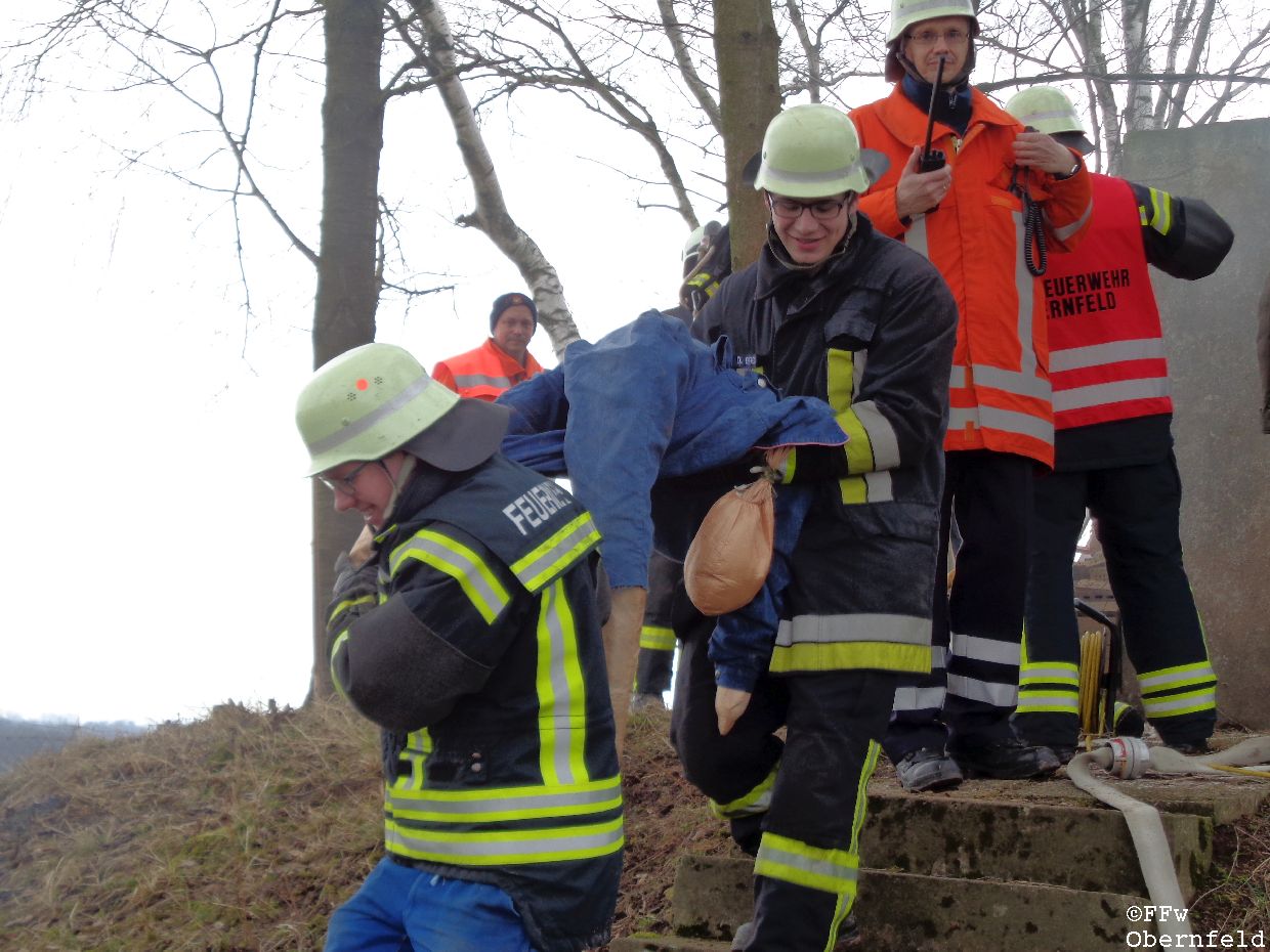 Am Samstag, den 25.02.2017 wurde die Freiwillige Feuerwehr Obernfeld mit dem Stichwort "Technische Hilfeleistung, 2 vermisste Personen" zum alten Wasserbehälter am Flutberg alarmiert. Vor Ort ergab sich für die Einsatzkräfte folgende Lage: Bei Bauarbeiten im unterirdischen Behälter kam es zu einer unbekannten Explosion, wodurch dieser stark verraucht wurde. Der Eingang wurde durch Trümmer versperrt, wodurch ein Einstieg nur über eine 4 Meter hohe Luke möglich war. 2 Angriffstrupps nahmen unter Atemschutz eine Steckleiter vor, und begaben sich über diese in den Behälter. Die 2 gemeldetet Vermissten konnten sich selbst über die aufgestellte Leiter unter aufsicht eines Angriffstrupps retten, berichteten aber von einer dritten Person. Diese wurde kurz darauf bewusstlos aufgefunden. Um diese Person retten zu können, wurde sie in eine sog. "Rettungswindel" eingebunden, und über dem Einstiegsluk mittels Steckleitern ein Leiterbock errichtet, durch den ein gesichertes Heraufziehen des Verletzten möglich war. Nach ca. 35 Minuten konnte an die Leitstelle Göttingen gemeldet werden, das alle Personen gerettet wurden und keine weiteren Gefahren bestanden. |