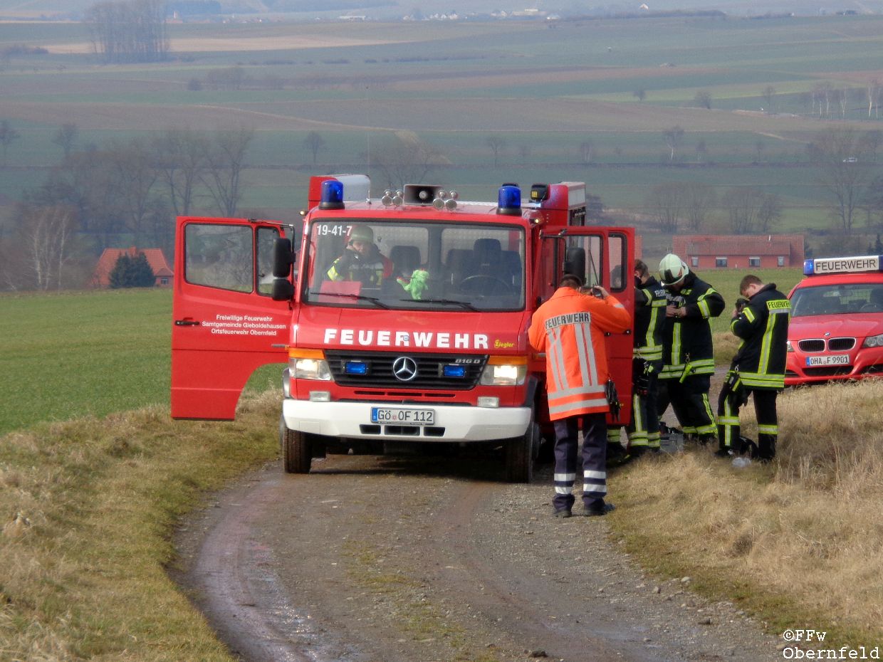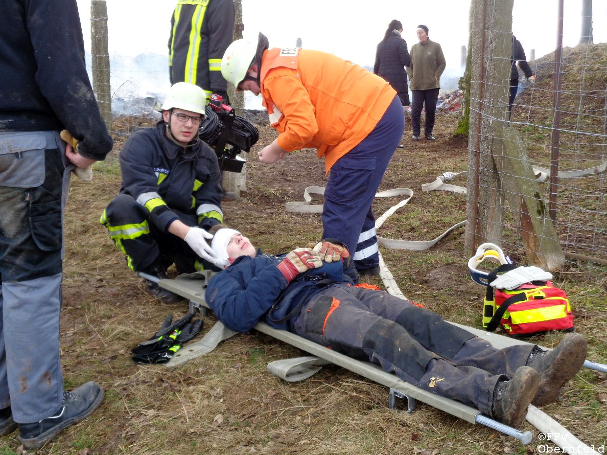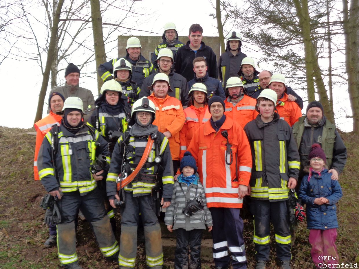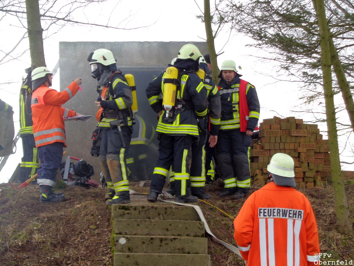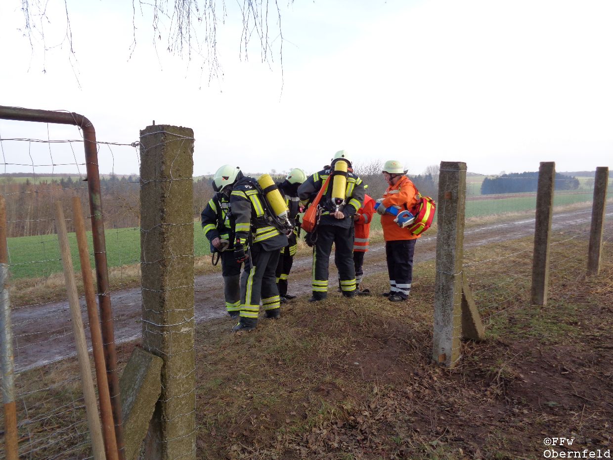 Am Samstag, den 25.02.2017 wurde die Freiwillige Feuerwehr Obernfeld mit dem Stichwort "Technische Hilfeleistung, 2 vermisste Personen" zum alten Wasserbehälter am Flutberg alarmiert. Vor Ort ergab sich für die Einsatzkräfte folgende Lage: Bei Bauarbeiten im unterirdischen Behälter kam es zu einer unbekannten Explosion, wodurch dieser stark verraucht wurde. Der Eingang wurde durch Trümmer versperrt, wodurch ein Einstieg nur über eine 4 Meter hohe Luke möglich war. 2 Angriffstrupps nahmen unter Atemschutz eine Steckleiter vor, und begaben sich über diese in den Behälter. Die 2 gemeldetet Vermissten konnten sich selbst über die aufgestellte Leiter unter aufsicht eines Angriffstrupps retten, berichteten aber von einer dritten Person. Diese wurde kurz darauf bewusstlos aufgefunden. Um diese Person retten zu können, wurde sie in eine sog. "Rettungswindel" eingebunden, und über dem Einstiegsluk mittels Steckleitern ein Leiterbock errichtet, durch den ein gesichertes Heraufziehen des Verletzten möglich war. Nach ca. 35 Minuten konnte an die Leitstelle Göttingen gemeldet werden, das alle Personen gerettet wurden und keine weiteren Gefahren bestanden. |