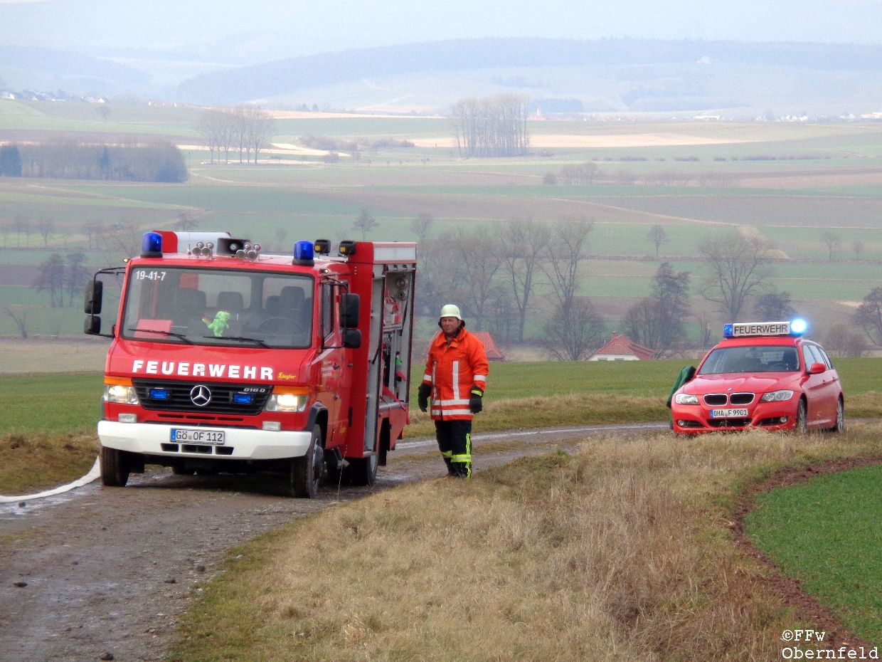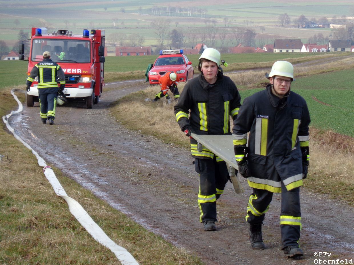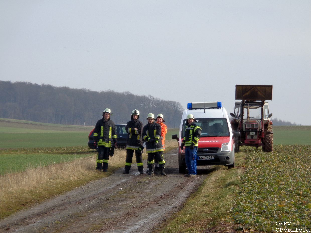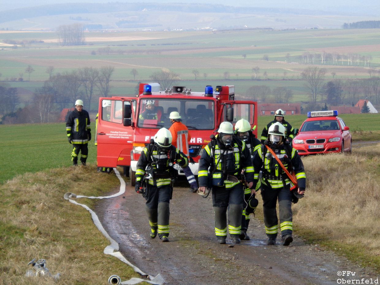 Am Samstag, den 25.02.2017 wurde die Freiwillige Feuerwehr Obernfeld mit dem Stichwort "Technische Hilfeleistung, 2 vermisste Personen" zum alten Wasserbehälter am Flutberg alarmiert. Vor Ort ergab sich für die Einsatzkräfte folgende Lage: Bei Bauarbeiten im unterirdischen Behälter kam es zu einer unbekannten Explosion, wodurch dieser stark verraucht wurde. Der Eingang wurde durch Trümmer versperrt, wodurch ein Einstieg nur über eine 4 Meter hohe Luke möglich war. 2 Angriffstrupps nahmen unter Atemschutz eine Steckleiter vor, und begaben sich über diese in den Behälter. Die 2 gemeldetet Vermissten konnten sich selbst über die aufgestellte Leiter unter aufsicht eines Angriffstrupps retten, berichteten aber von einer dritten Person. Diese wurde kurz darauf bewusstlos aufgefunden. Um diese Person retten zu können, wurde sie in eine sog. "Rettungswindel" eingebunden, und über dem Einstiegsluk mittels Steckleitern ein Leiterbock errichtet, durch den ein gesichertes Heraufziehen des Verletzten möglich war. Nach ca. 35 Minuten konnte an die Leitstelle Göttingen gemeldet werden, das alle Personen gerettet wurden und keine weiteren Gefahren bestanden. |